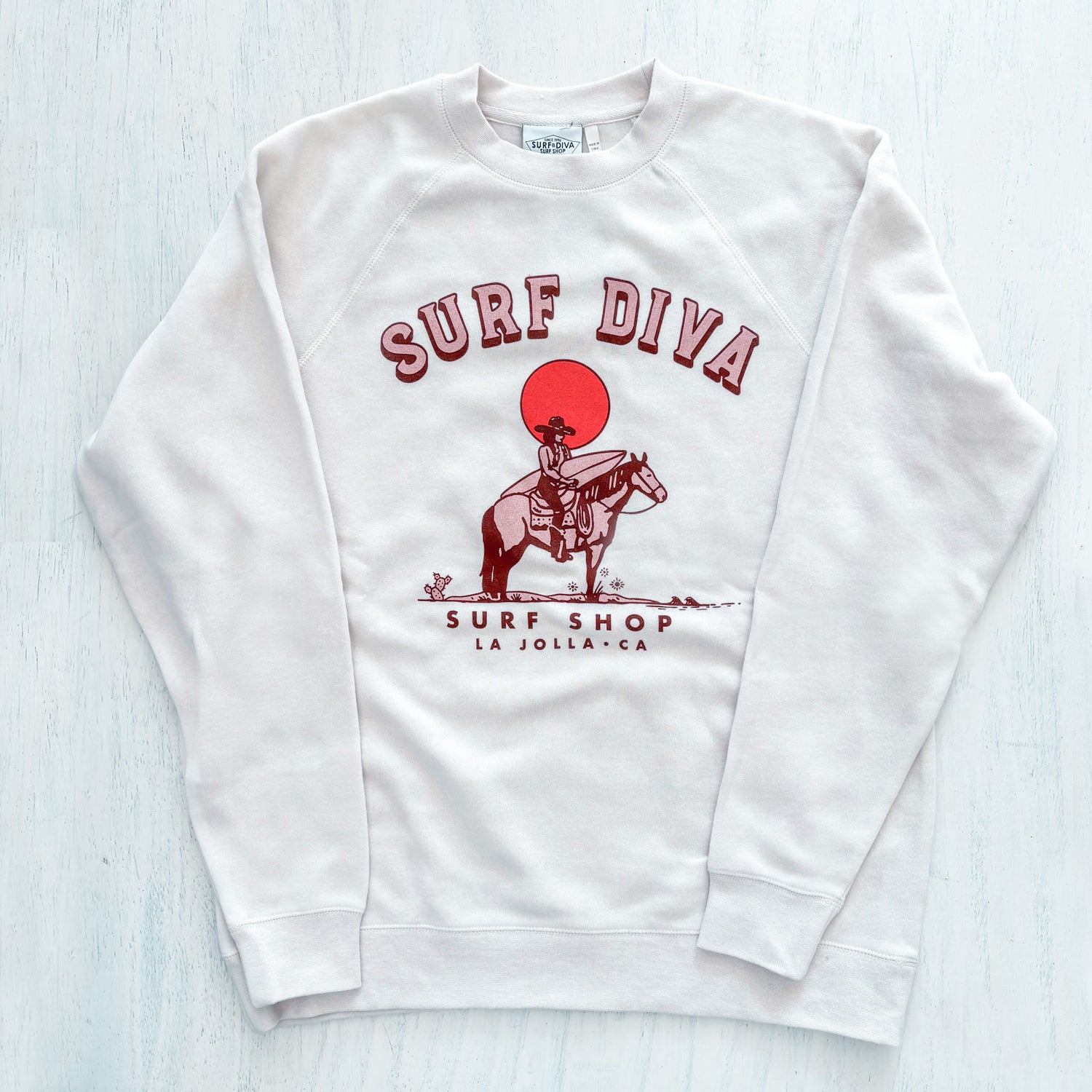 This ultra-soft crewneck features a cowgirl holding her surfboard, riding her horse straight into the sunset (or sunrise, depending on when the swell report hits). It’s for those who split their time between saltwater and saddle leather, who know that dawn patrol can happen at the beach or the barn.