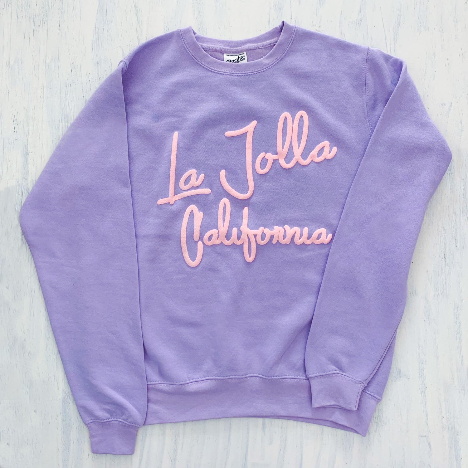 In the early 1900s, La Jolla transformed from a quiet coastal escape into a bright, beloved seaside retreat. With travelers soaking in ocean air and artists painting seaside vistas, the town radiated warmth, color, and creativity. This crewneck brings that history to life in a joyful sunset sorbet palette celebrating lavender with soft pink script, like your favorite ice cream melting into a cotton candy sky.