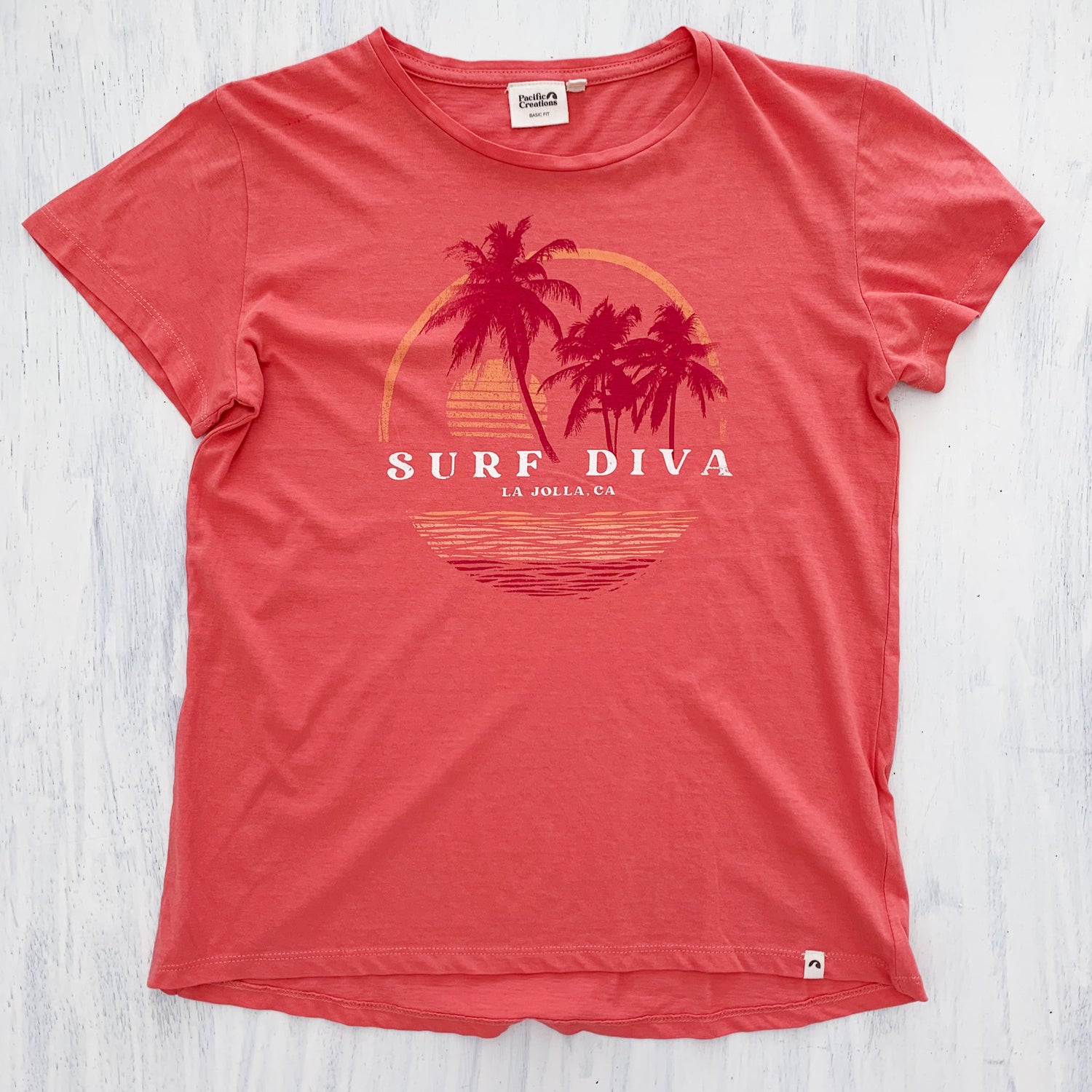 Catch the perfect wave of style with our Surf Diva La Jolla CA women’s graphic tee. Designed for palm trees and beach lovers , this soft, coral-pink t-shirt brings the laid-back California vibe wherever you go. Featuring a vintage-inspired palm tree sunset print, it’s your go-to top for surf days, seaside strolls, or simply dreaming of the coast.