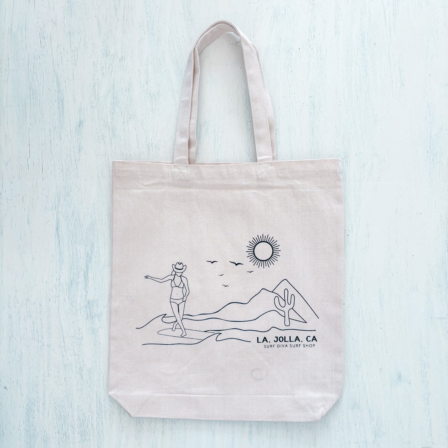 Bring a splash of fun to your everyday adventures with our medium canvas tote bag in a natural, durable shade. Featuring a playful surfer girl rocking a cowboy hat in bold black print, this tote is perfect for daily use, beach trips, errands, or carrying all your essentials in style.