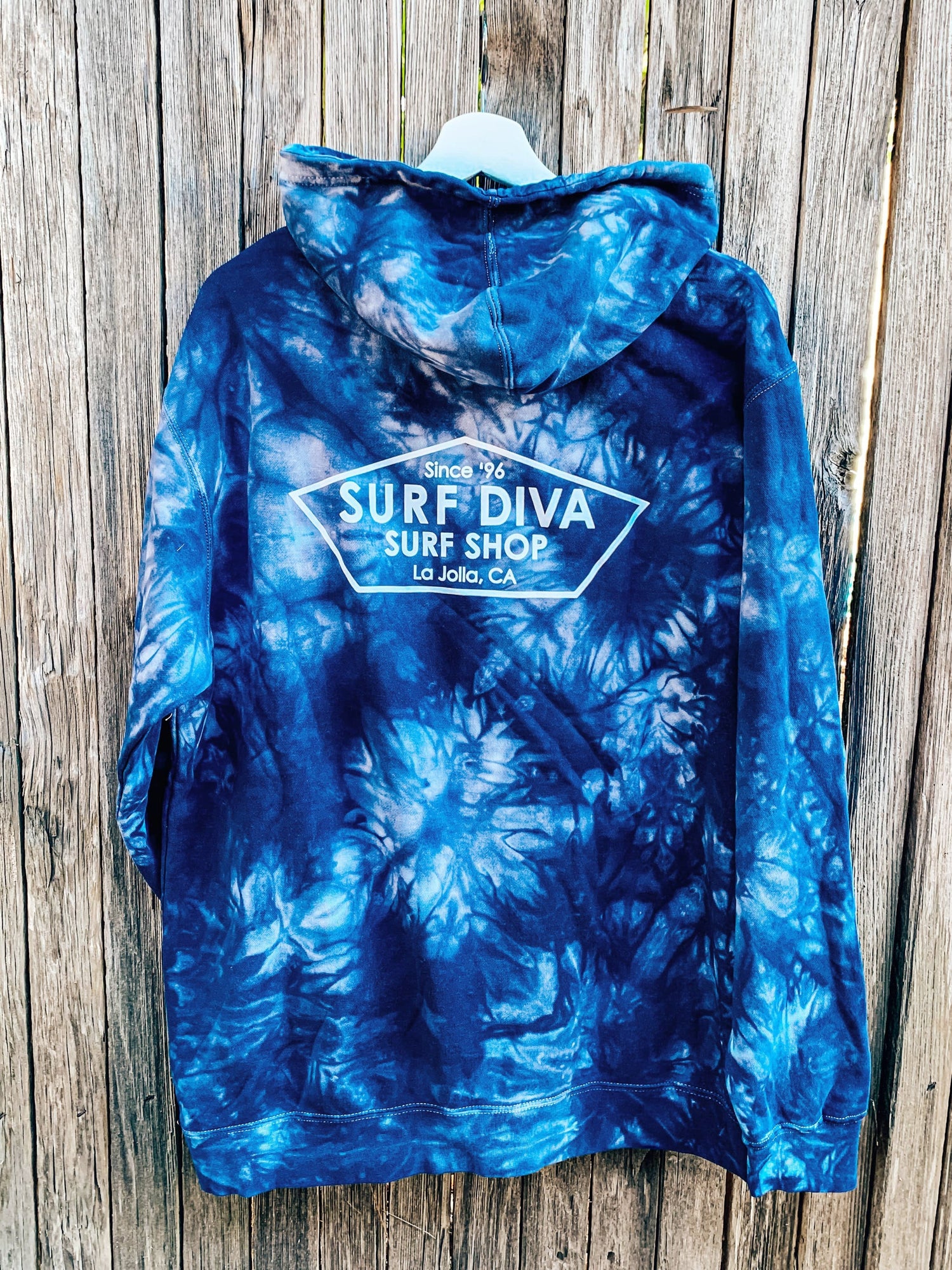 Tie-dye isn't a pattern, it's a lifestyle! Represent your favorite San Diego surf shop with our classic Surf Diva Surf Shop hoodie in tie-dye!