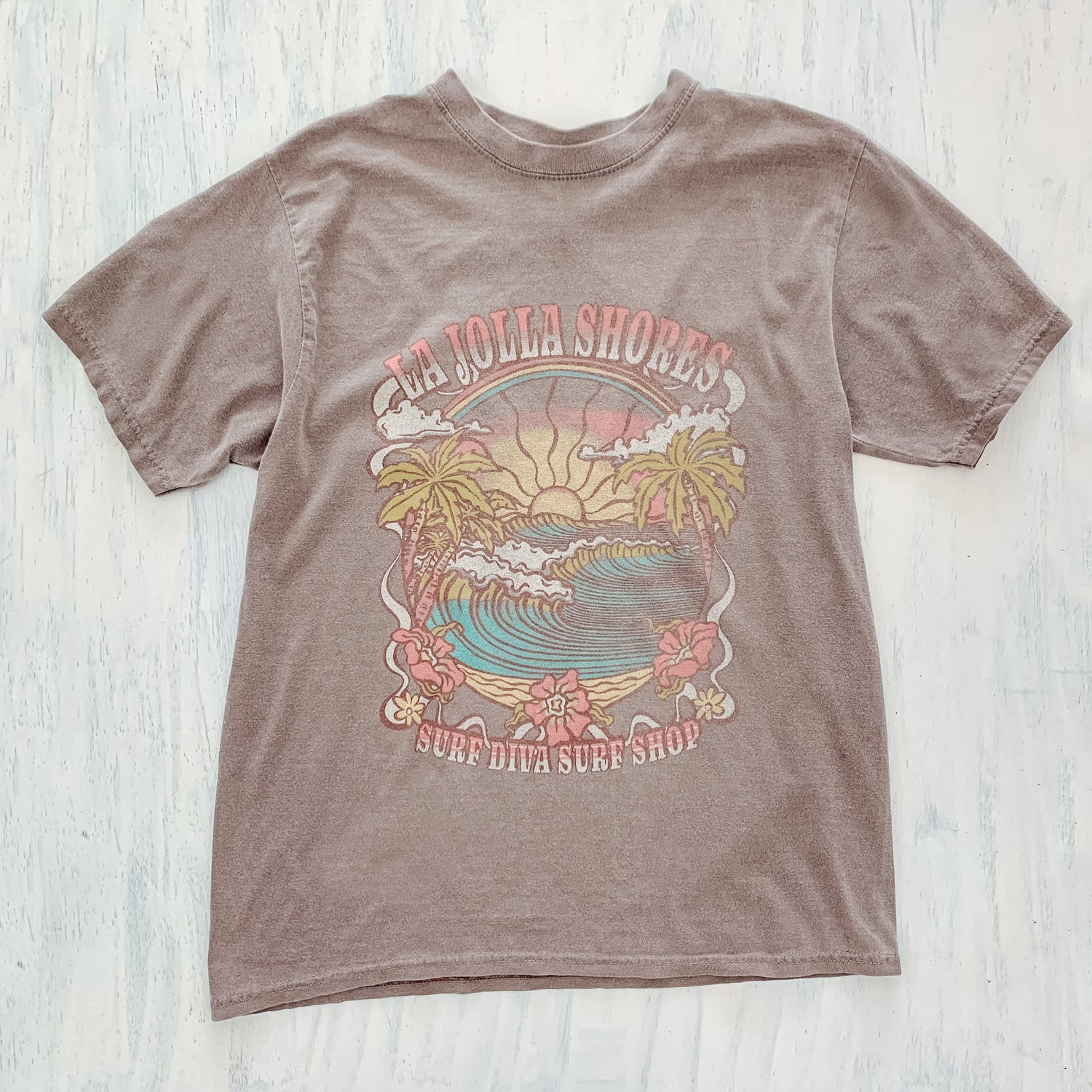 The bold front graphic features a statement wave design with La Jolla Shores and Surf Diva Surf Shop — a nod to surf culture and coastal California style. With its washed-out finish and easy, relaxed fit, this tee is made for beach days, coffee runs, and everything in between.