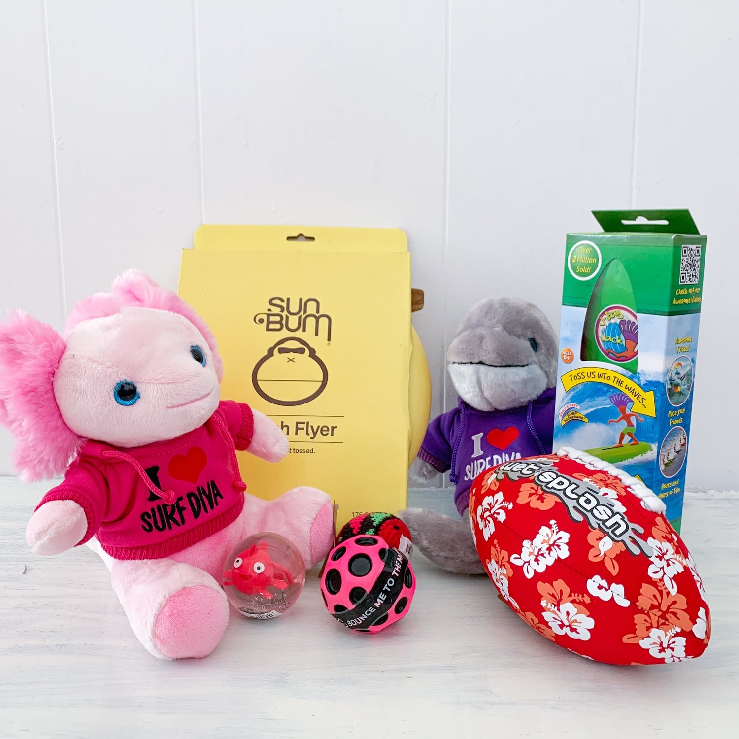 Our brick and mortar surf shop carries a large variety of fun toys for the beach and souvenir stuffed animals, hat, magnets, as well as kids sunglasses, jewelry and much more. Ask us about ideas for your group specifically and we are happy to help!